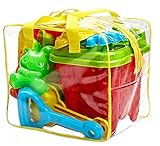 Beach Set in Zippered Bag Castle Bucket 15 Pc Set. This colorful set of plastic sand toys includes everything you need for a fun day at the beach! Castle Bucket with a handle , 2 hand tools, watering can, Sand Sifter (bucket cover), 2 castle molds, 8 molds ( dino, hand, bunny, alligator, turtle, 2 round castles, crocodile, ). Great quality, comes with Zippered bag, very convenient for a beach trip. Big fun in the sun and sand - toys that promote creativity and active play while having fun in the sun.