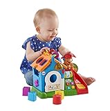 Open the door to a playhouse that's loaded with busy activities and fun for your little one - led by Puppy who's ready to shake, rattle and roll. (He is a rattle, after all!) You never know who or what will drop in through the shape sorter roof that opens & closes for put-and-take play. This adorable activity play set provides 4 shapes to sort and 8 ways to activate learning content. Opening & closing the front door teaches opposites, the 4 shape buttons introduce numbers, colors & shapes - even going down the slide triggers fun sounds & phrases. There's plenty of fun finger play for tots, including a roller to spin, beads to clack, a doorbell to push & a tree wheel to turn! And it's ready to go mobile anytime - the easy-carry handle lets baby take learning fun on the run. The Fisher-Price Laugh & Learn Smart Stages Activity Playhouse includes Smart Stages technology, an exciting way to change learning content as baby grows. Every baby develops at his or her own pace and Smart Stages technology gives you the ability to select the stage that's best for your child! There are a variety of developmentally appropriate songs, phrases and sounds within three levels of play - just slide the switch for level changes. Smart Stages Technology: Level 1 - Explore - 9M+: First words and sounds spark baby's curiosity; Level 2 - Encourage - 12M+: Prompt baby through questions and simple directions; Level 3 - Pretend - 18M+ Imaginative fun and early role play.